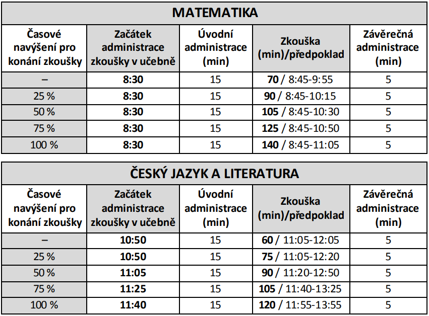 Obsah zkoušky odpovídá rámcovému vzdělávacímu programu pro základní vzdělávání. Zkouška se skládá se z písemného testu v oboru Český jazyk a literatura v délce 60 minut a z písemného testu v oboru Matematika a její aplikace v délce 70 minut.