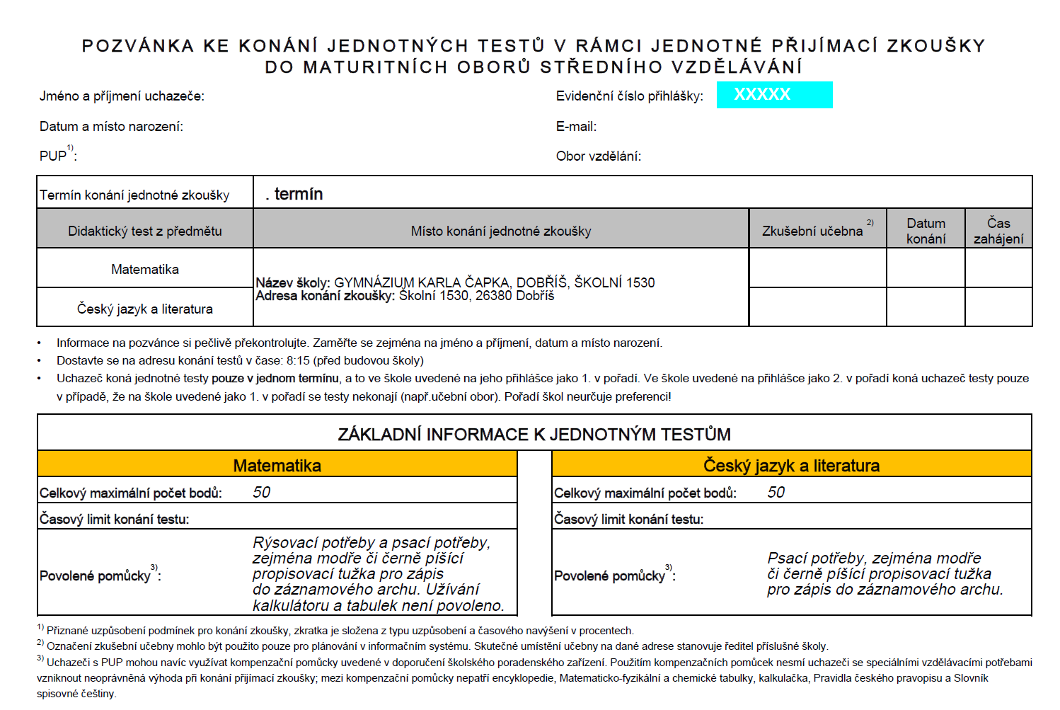 Na pozvánce je uvedeno evidenční číslo přihlášky (viz tyrkysové pole na vzoru). Tímto číslem bude uchazeč identifikován ve výsledcích přijímacího řízení (v seznamu přijatých uchazečů).